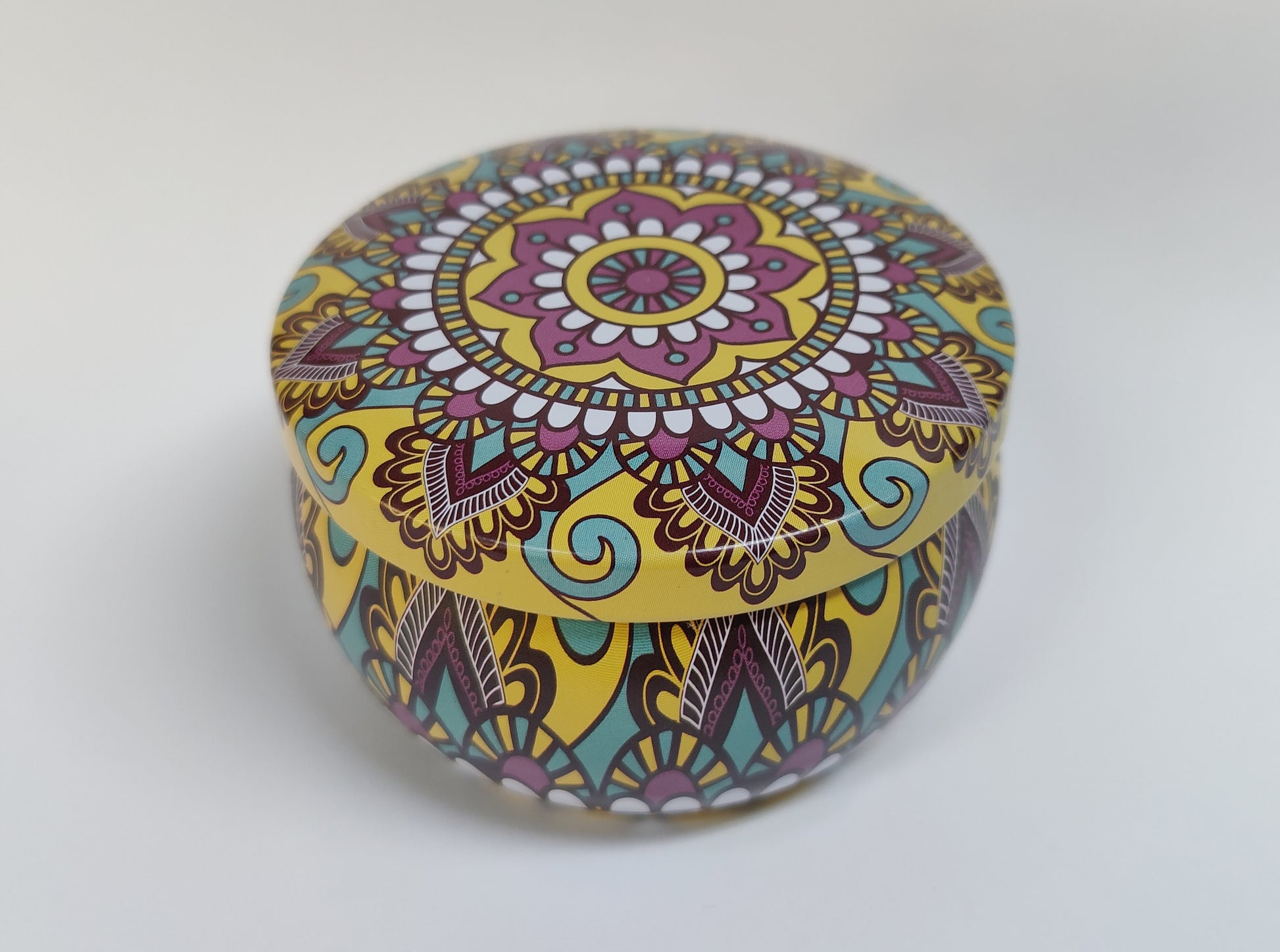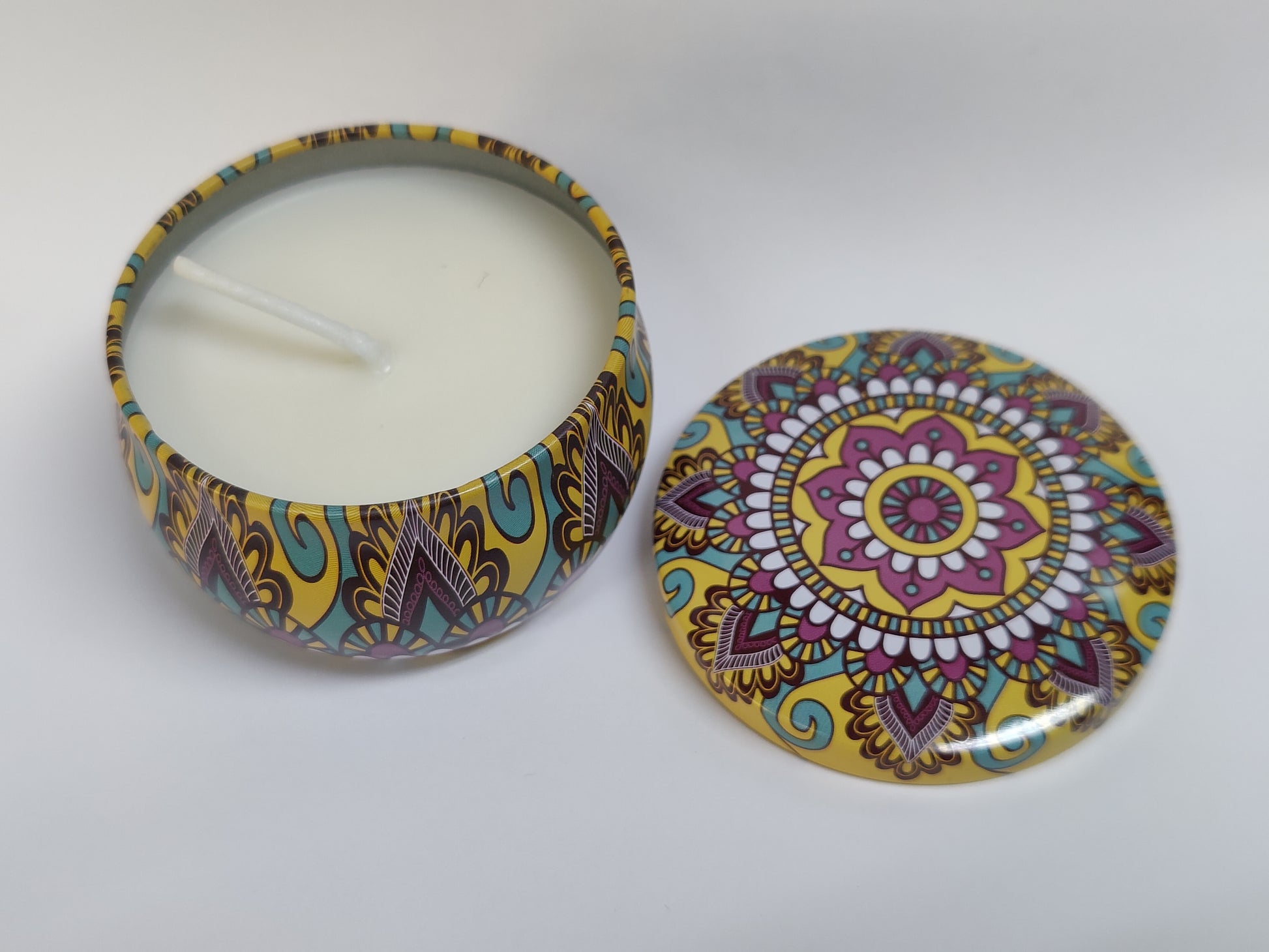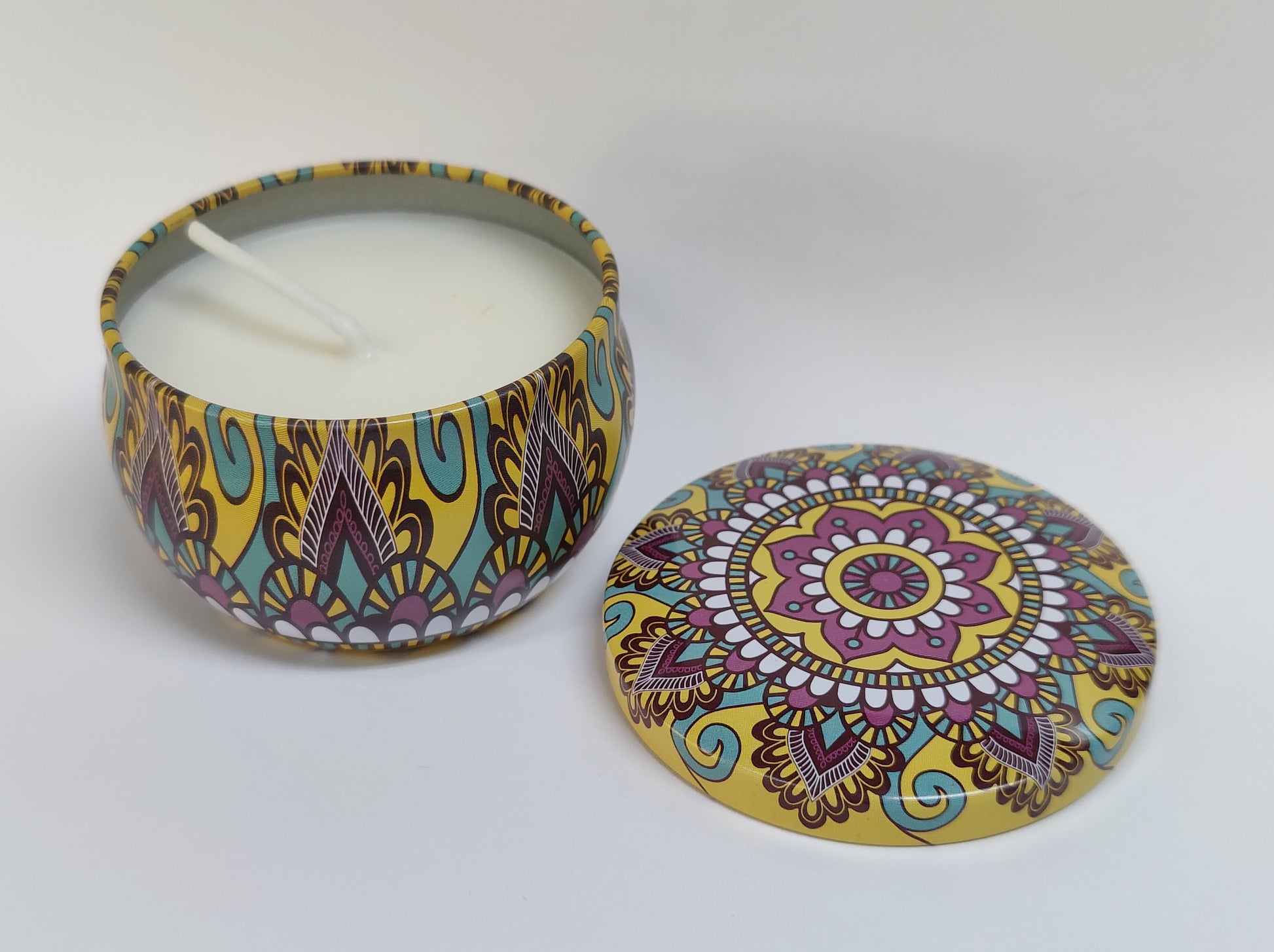 Kauniiseen metalliseen kynttiläkuppiin valettu, käsin soijavahasta valmistettu kynttilä.